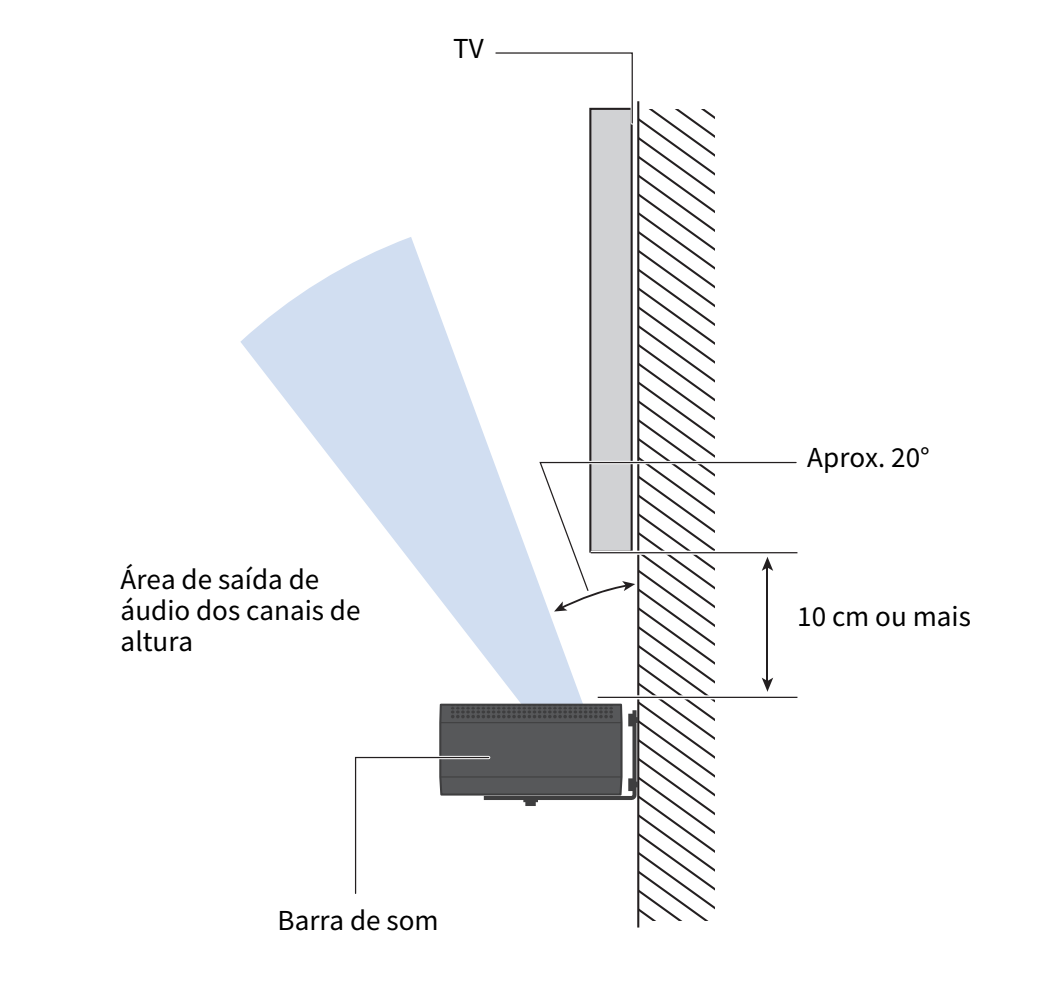 Um espaço de pelo menos 10 cm acima da parte superior da barra de som garante a saída livre dos canais de altura. Isso lhe proporcionará o melhor campo de som surround possível.