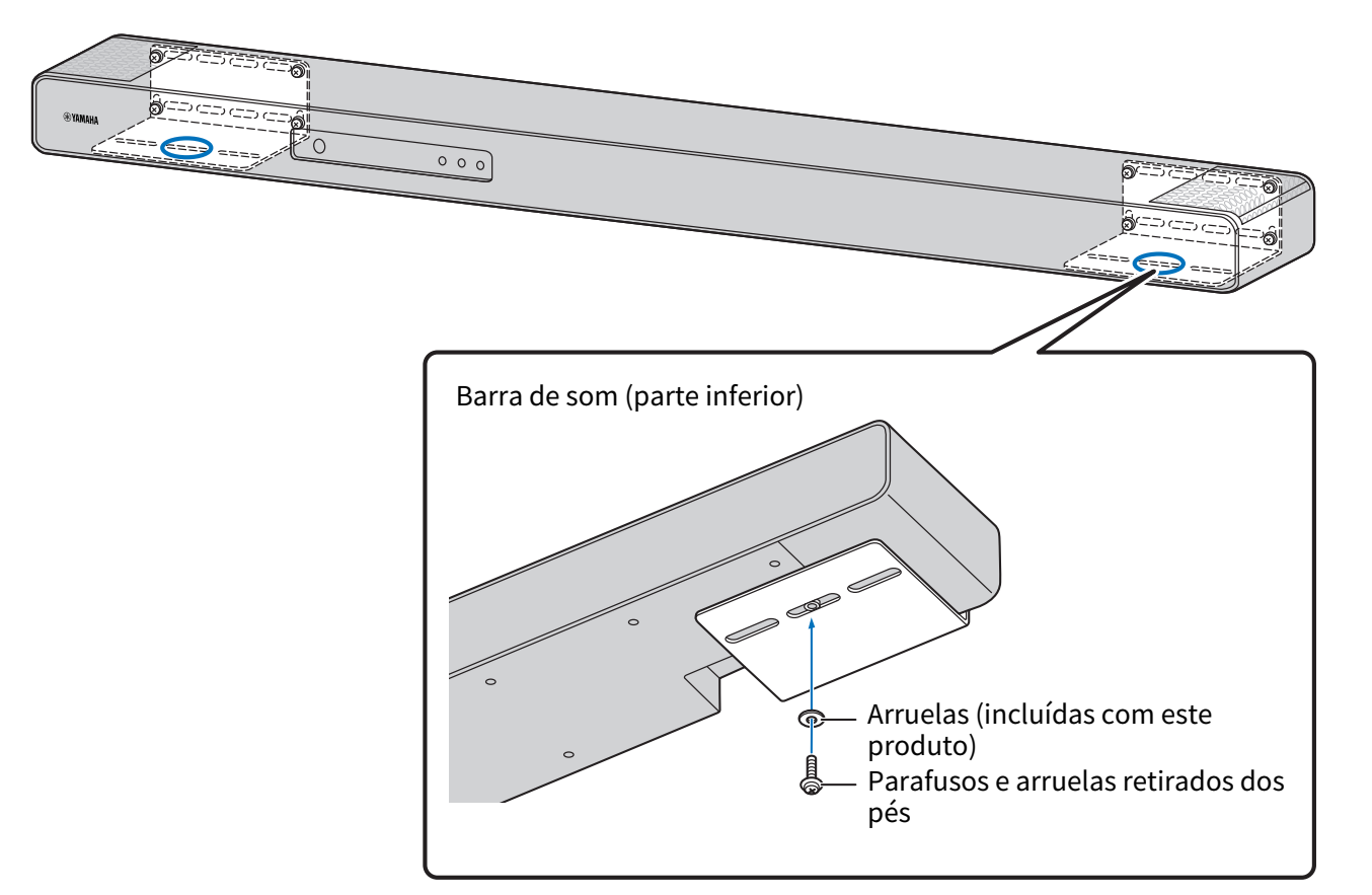 - Os parafusos e as arruelas serão reutilizados para fixar os suportes de montagem e a barra de som.