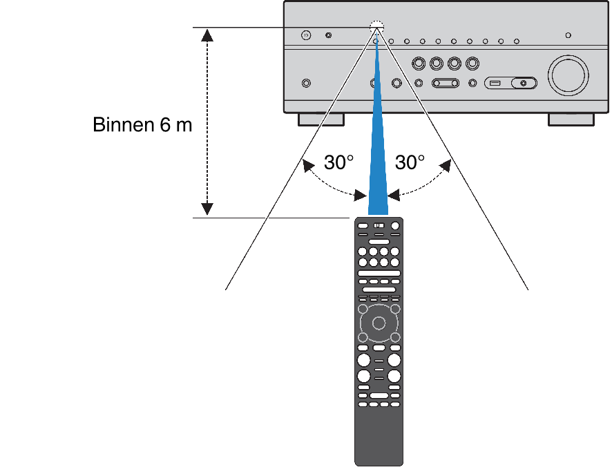 Richt de afstandsbediening op de afstandsbedieningssensor op het toestel en blijf daarbij binnen het bereik zoals u op de volgende afbeelding kunt zien.