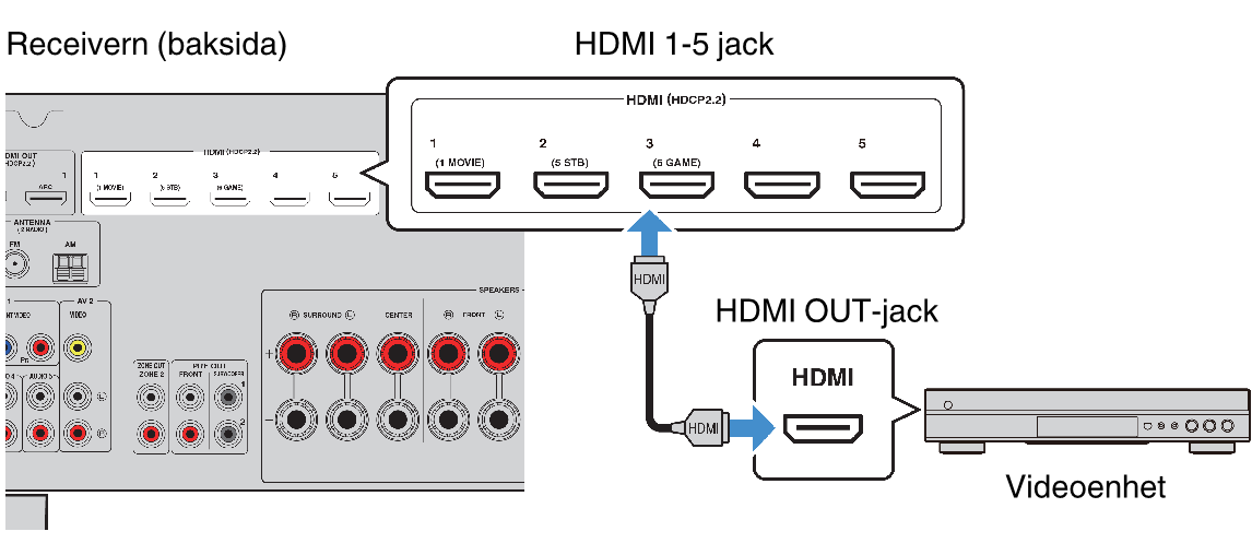 Anslut en videoenhet till receivern med en HDMI-kabel.