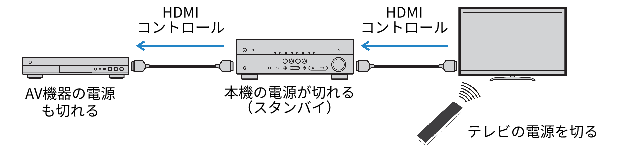 HDMIケーブルで本機とテレビを接続すると、テレビのリモコン操作に連動して、本機の電源や音量などを操作できます(HDMIコントロール)。またHDMIケーブルで接続したAV機器(HDMIコントロール対応のBD/DVDプレーヤーなど)も操作できます。