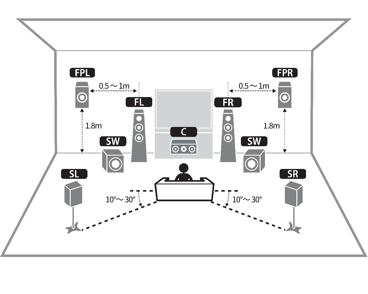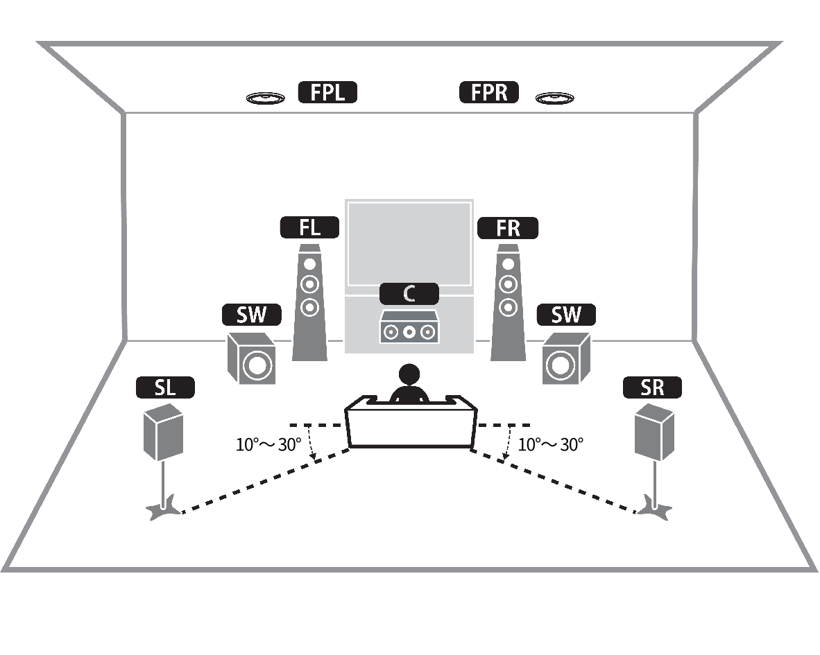 - プレゼンススピーカーを天井に配置する場合や、ドルビーイネーブルドスピーカーをプレゼンススピーカーとして使用する場合は、設定の変更が必要です。詳しくは次をご覧ください。