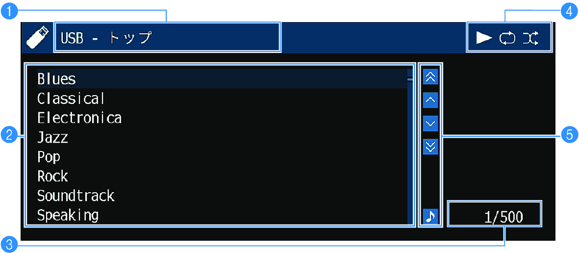 リピート再生/シャッフル再生の設定、および再生状態(再生/一時停止など)が表示されます。 | |