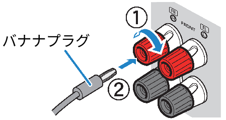 - バナナプラグを使用する場合は、スピーカー端子をゆるめずに、バナナプラグを端子に差し込んでください。