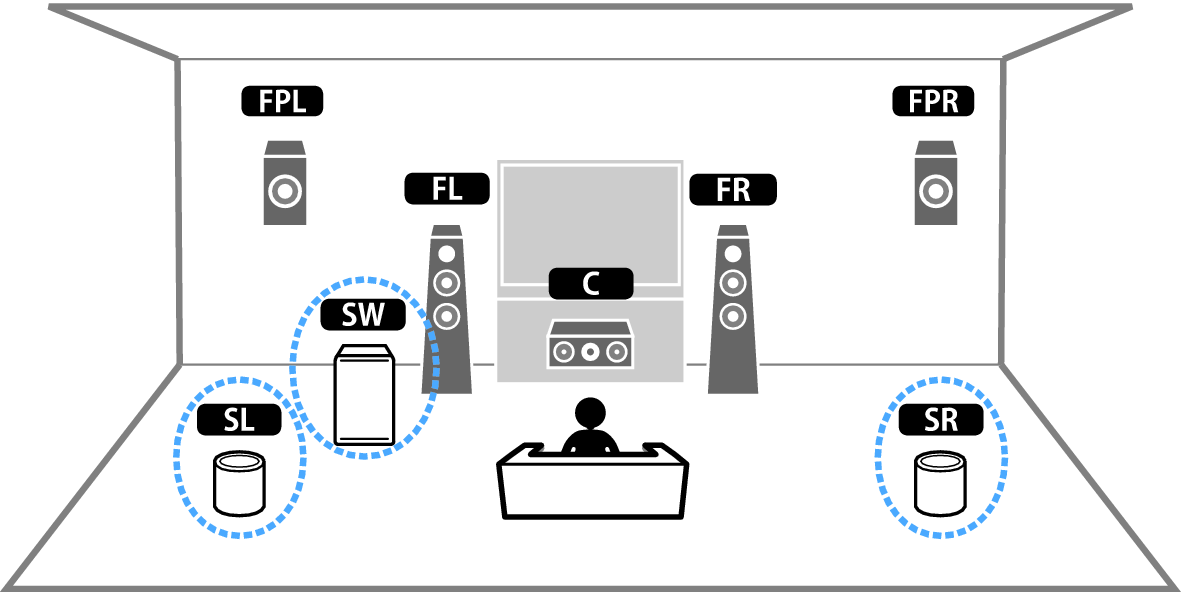 The following is a 5.1.2-channel system using two MusicCast 20 speakers as the surround speakers and one MusicCast SUB 100 as the subwoofer.