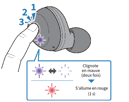 - Quand le témoin se met à clignoter, appuyez trois fois sur la touche de fonction du casque droit (R) dans les 10 secondes suivant le début du clignotement.