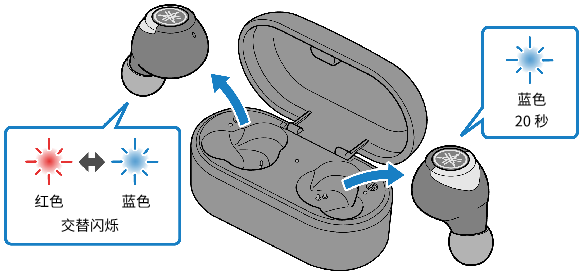 - 如果两个耳机交替闪烁红色和蓝色,表示无法成功注册(配对)。请将两个耳机放入充电盒,再取出。