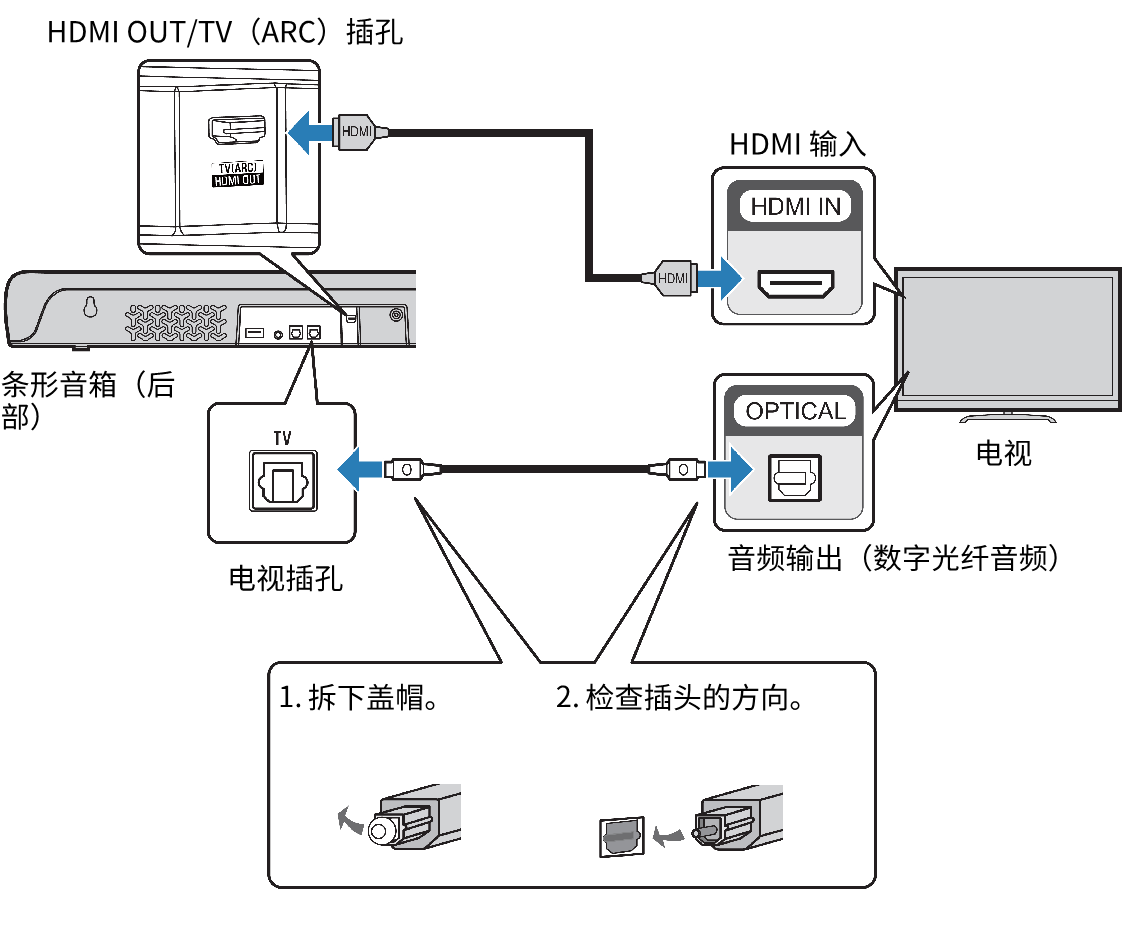 使用 HDMI 缆线(另售)和随附的数字光纤音频缆线连接电视。