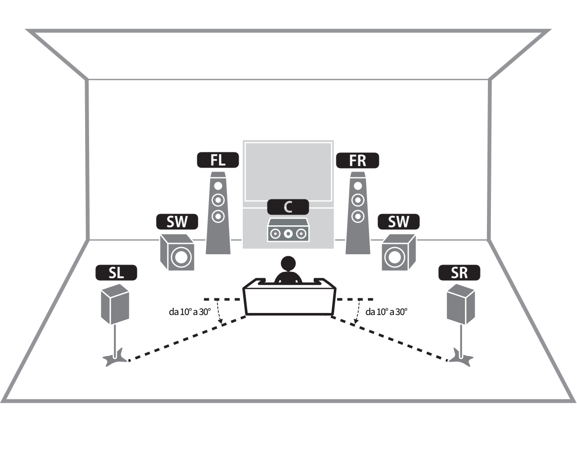 Questo è il layout di base del diffusore consigliato per ascoltare suoni surround.