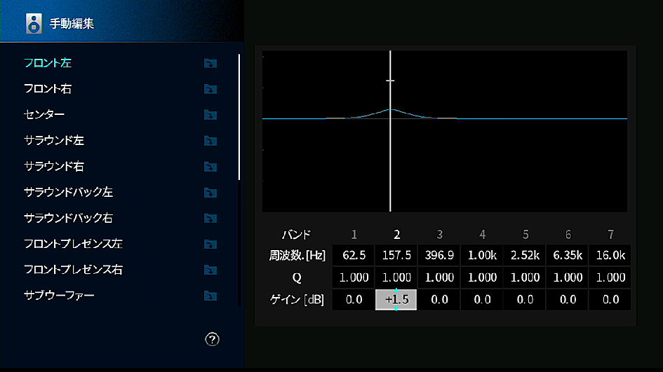 イコライザーを手動で調節します。「スピーカー設定」の「パラメトリックイコライザー」で「手動編集」から行ってください。