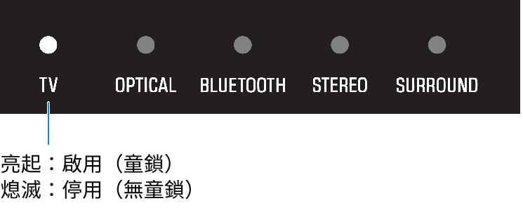 指示燈會顯示如下套用的設定,並且條形音箱開啟。