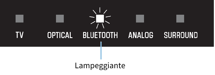 - Una volta stabilita la connessione, l’indicatore BLUETOOTH della soundbar smette di lampeggiare e rimane acceso il blu.