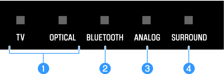 - Индикаторы на саундбаре будут показывать следующую информацию о типе аудиосигнала и настройках для функций в течение трех секунд сразу после нажатия INFO.
