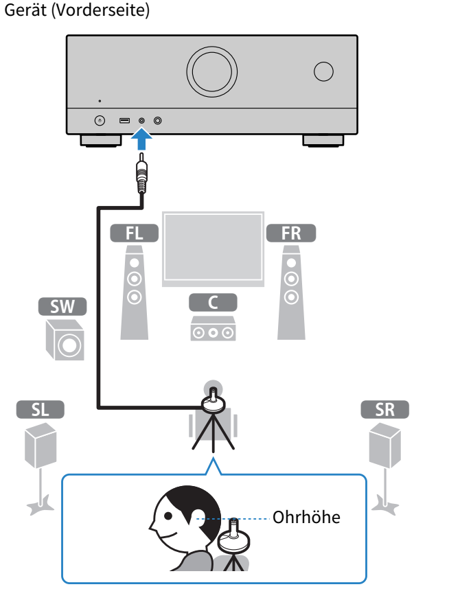 Richten Sie vor Gebrauch die Lautsprechereinstellungen wie Lautstärkebalance und akustische Parameter ein. Mithilfe des mitgelieferten YPAO-Mikrofons erfasst das Gerät Lautsprecherverbindungen und misst die Entfernungen von den Lautsprechern zu Ihrer Hörposition, die als Messposition vorgegeben wird. Danach optimiert das Gerät die Lautsprechereinstellungen wie Lautstärkebalance und akustische Parameter automatisch. (YPAO: Yamaha Parametric room Acoustic Optimizer)
