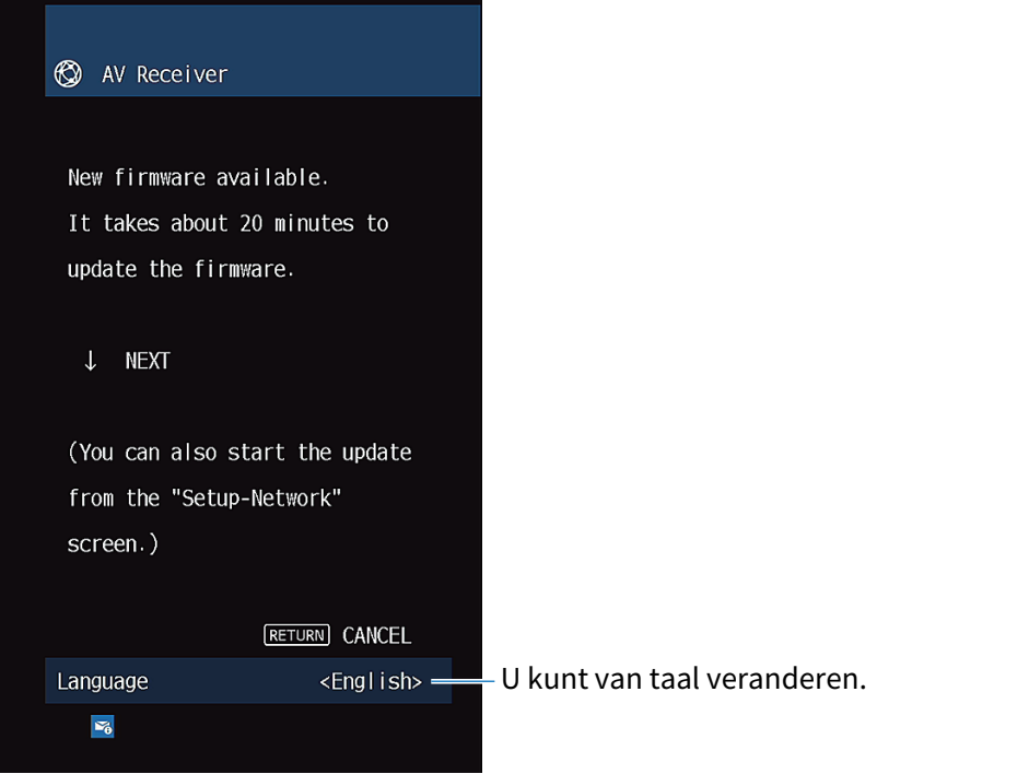 - Om het bijwerken van de firmware te annuleren, moet u op RETURN op het voorpaneel of op de afstandsbediening drukken zodat het toestel wordt uitgeschakeld.