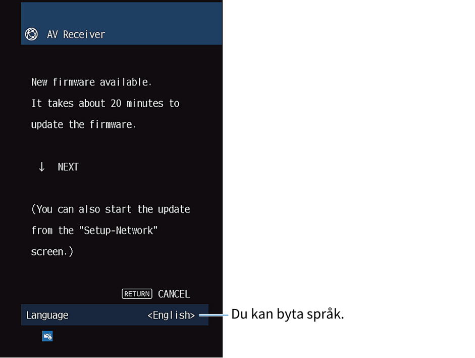 - För att avbryta firmware uppdateringsförfarandet, tryck på RETURN på frontpanelen eller fjärrkontrollen och enheten kommer att slås av.