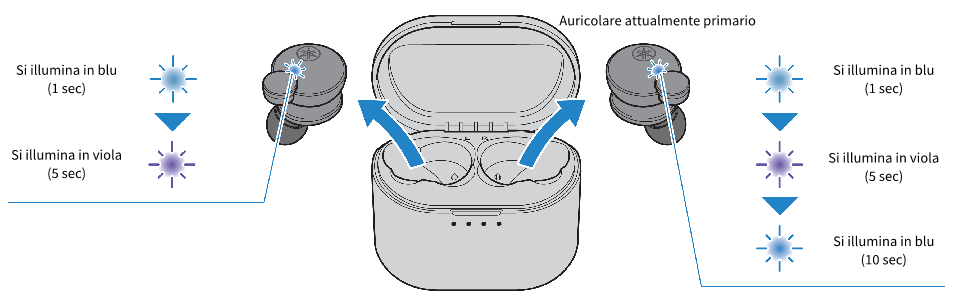 - Uno degli auricolari (L o R) sarà l'auricolare primario durante la connessione, a seconda dell'energia residua nella batteria.