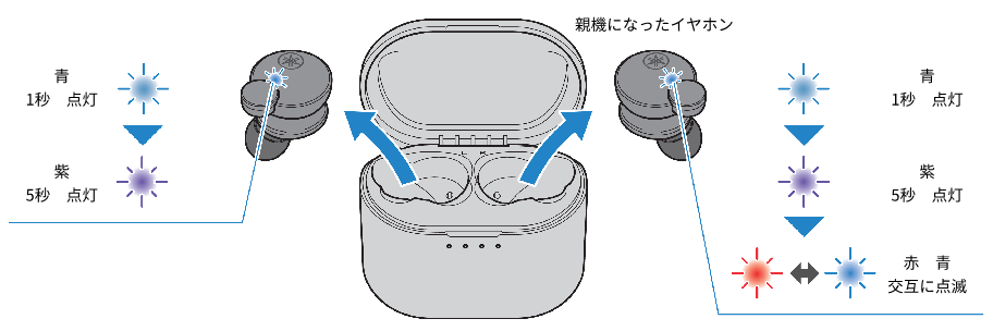 - イヤホンの電源がオンになり、左右のイヤホンが自動的に接続されます。イヤホン(L)またはイヤホン(R)のいずれかが親機となり、インジケーターが次の図のように表示され、ペアリング待ち状態となります。イヤホンから「Pairing(ペアリング)」の音声ガイドが流れます。 親機となるイヤホンは、イヤホン(L)とイヤホン(R)どちらでも問題ありません。