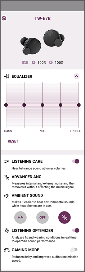 - Als u inschakelt, LISTENING OPTIMIZER wordt de audio realtime geanalyseerd en wordt de geluidskwaliteit afgestemd op de manier waarop dit product in uw oren past en op uw oorvorm.