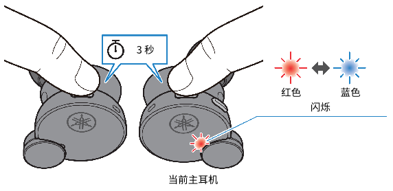 - 任何一个耳机 (L) 或 (R) 均可作为主耳机,其指示灯会交替闪烁红色和蓝色,同时您会听到消息“Pairing”。这表示耳机处于配对待机模式。