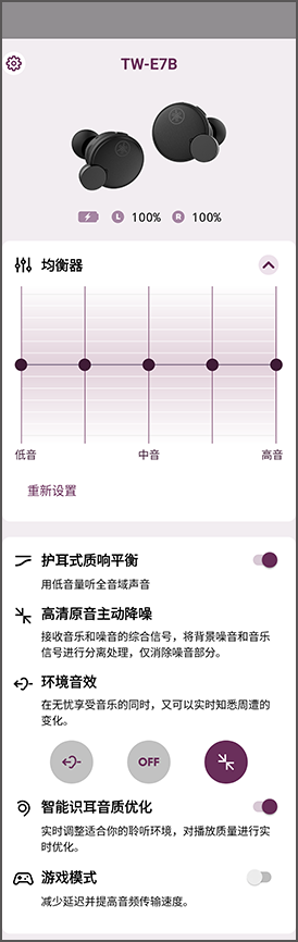 - 关闭(默认设置):环境音效 和 高清原音主动降噪 均禁用(常规播放模式)