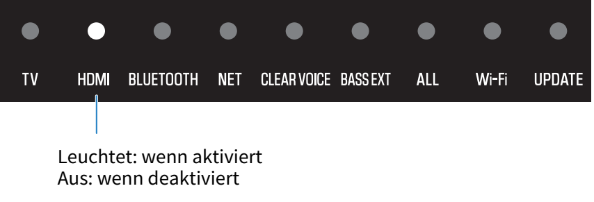 - Die Anzeigen informieren wie nachstehend über den Einstellungsstatus, und die Soundbar wird eingeschaltet.
