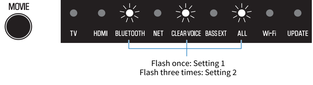 When the setting is switched, the indicators on the front of the sound bar show the selected setting as follows: