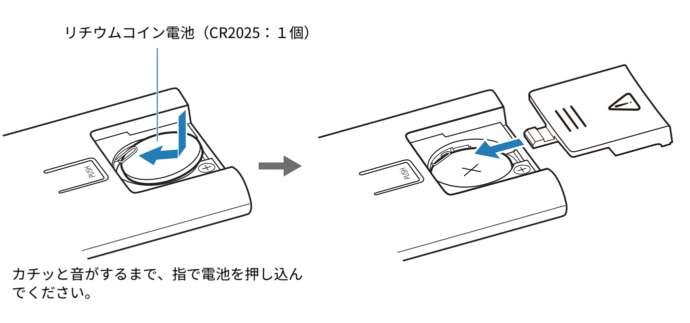 新しい電池を入れ、フタを矢印の方向にスライドして戻す。