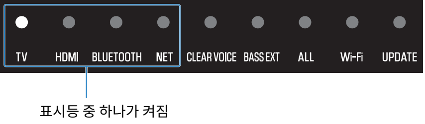 사운드 바 전면의 표시등은 선택한 입력 소스를 다음과 같이 표시합니다.