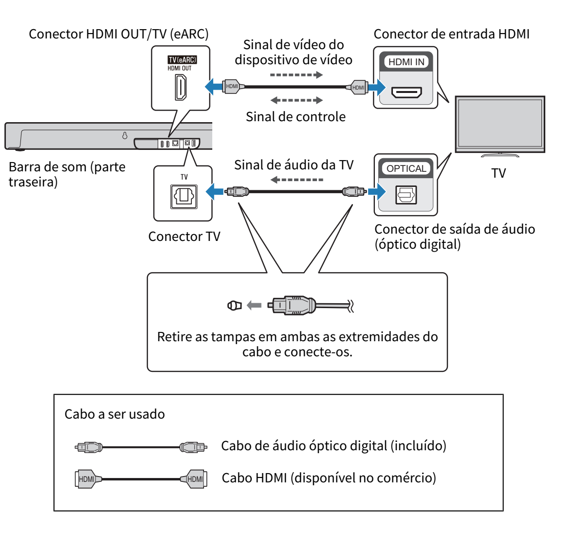 Conecte um cabo HDMI a um conector de entrada HDMI compatível com Audio Return Channel (rotulado como “eARC” ou “ARC”) na TV.