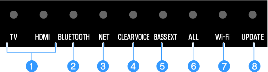- Индикаторы на саундбаре будут показывать следующую информацию о типе аудиосигнала и настройках для функций в течение трех секунд сразу после нажатия INFO.