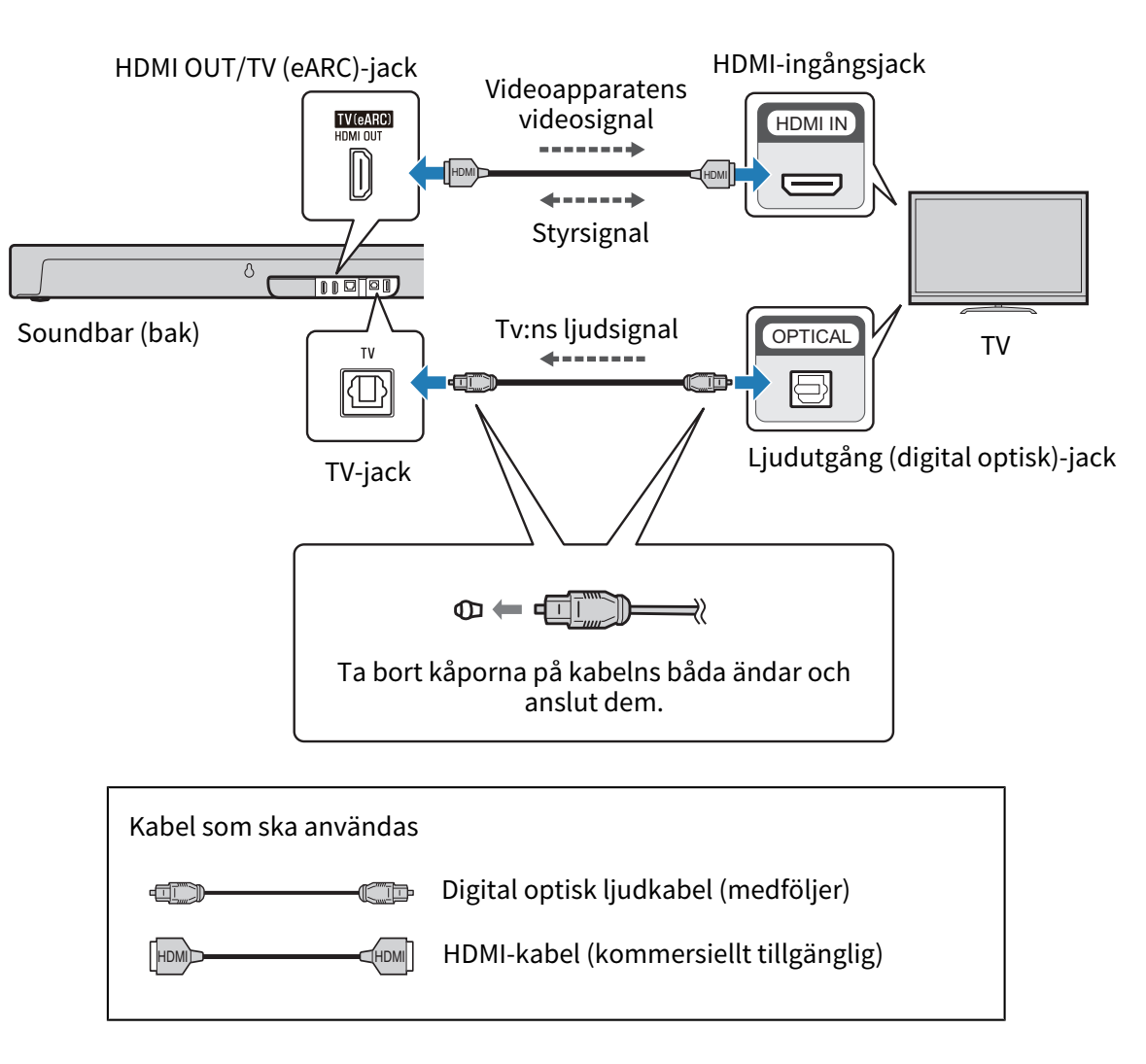 HDMI-kabeln överför TV:ns ljudsignal och styrsignaler för att styra soundbaren med TV:ns fjärrkontroll. Vidare, den överför videosignaler till TV:n från en AV-apparat som är ansluten till HDMI IN-jacket på soundbaren.
