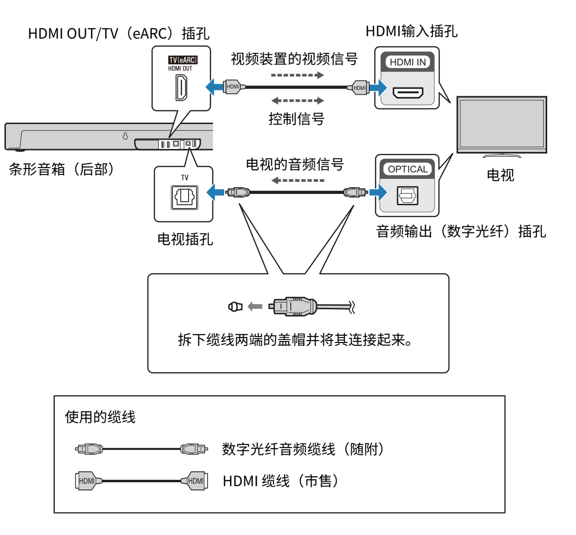 HDMI 缆线传输电视的音频信号和通过电视遥控器来控制条形音箱的控制信号。此外,它还将视频信号从连接到条形音箱上的 HDMI IN 插孔的 AV 装置传输到电视。
