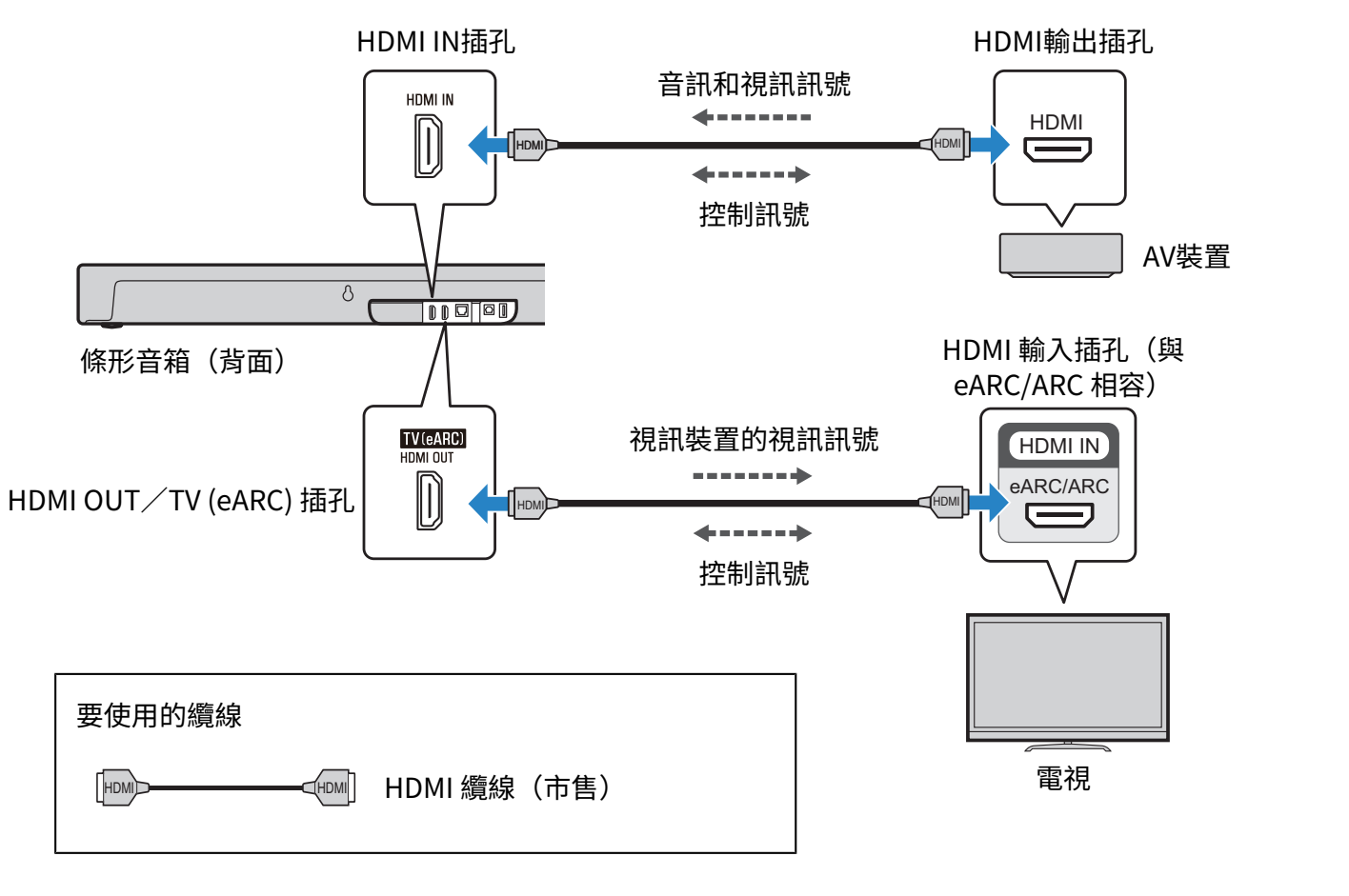 - 要連接條形音箱和電視,以及連接條形音箱和 AV 裝置,則使用支援傳輸從 AV 裝置輸出的視訊訊號的 HDMI 纜線。