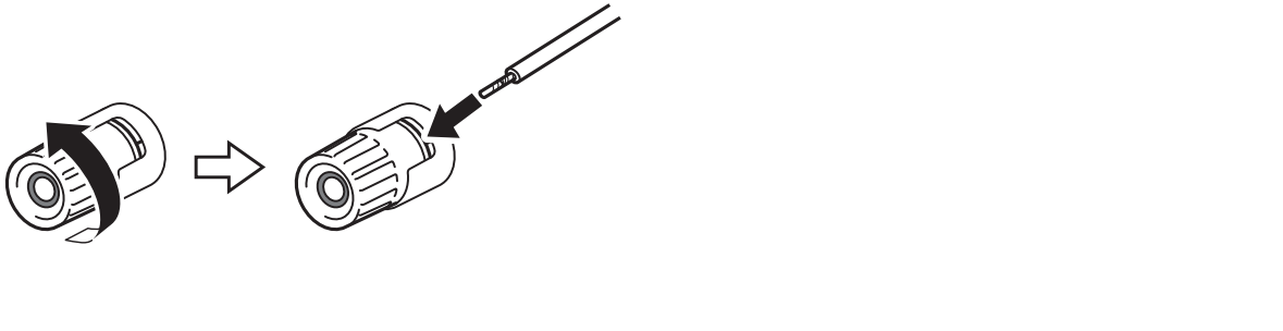- スピーカー端子のつまみを左に回してネジをゆるめ、端子の穴にスピーカーケーブルの芯線を差し込む。