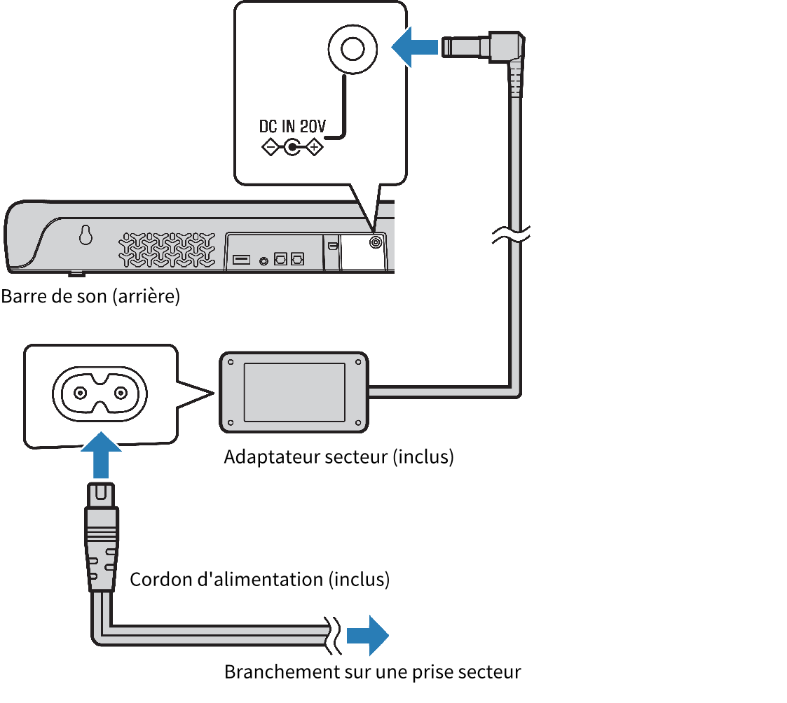 - Raccordez la barre de son et le caisson de graves à l’alimentation.