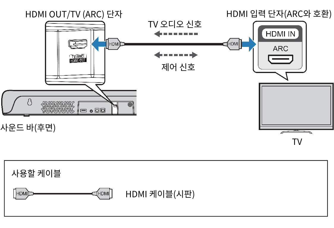 HDMI 케이블은 TV의 오디오 신호와 TV 리모컨을 사용하여 사운드 바를 제어하기 위한 제어 신호를 전송합니다.