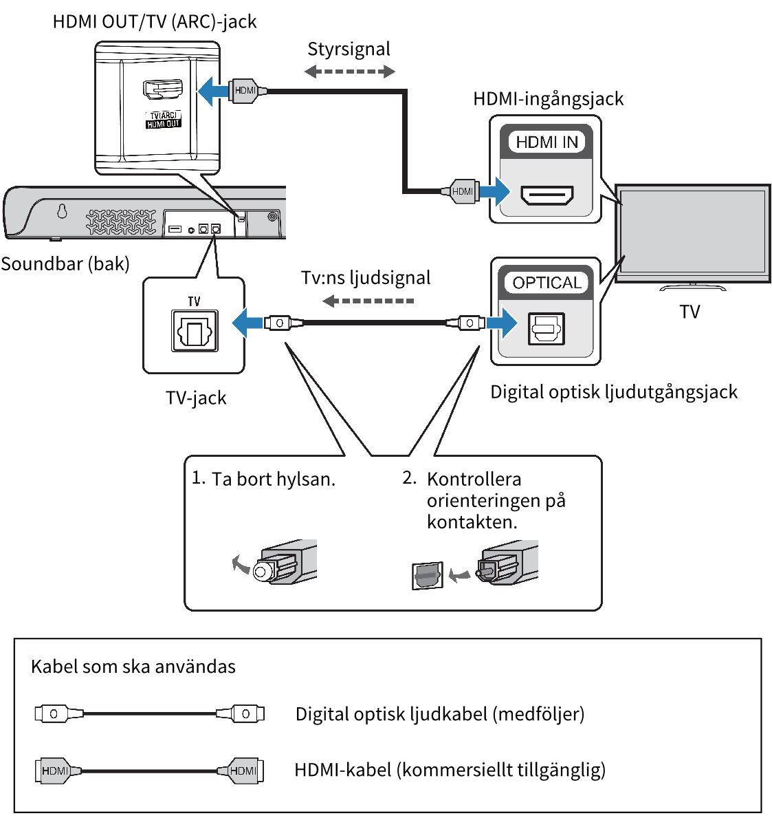 Den digitala optiska ljudkabeln överför TV:ns ljudsignal till soundbaren. HDMI-kabeln överför styrsignaler för att styra soundbaren med TV:ns fjärrkontroll (HDMI Control-funktion). Om du in till använda HDMI Control-funktionen behöver du inte ansluta en HDMI-kabel.