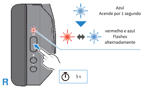 - Com este produto desligado, mantenha pressionada a tecla liga/desliga até que o indicador pisque conforme mostrado na ilustração abaixo. Você vai ouvir a "Pairing" mensagem de áudio e o produto entra no modo de espera de emparelhamento (registro).