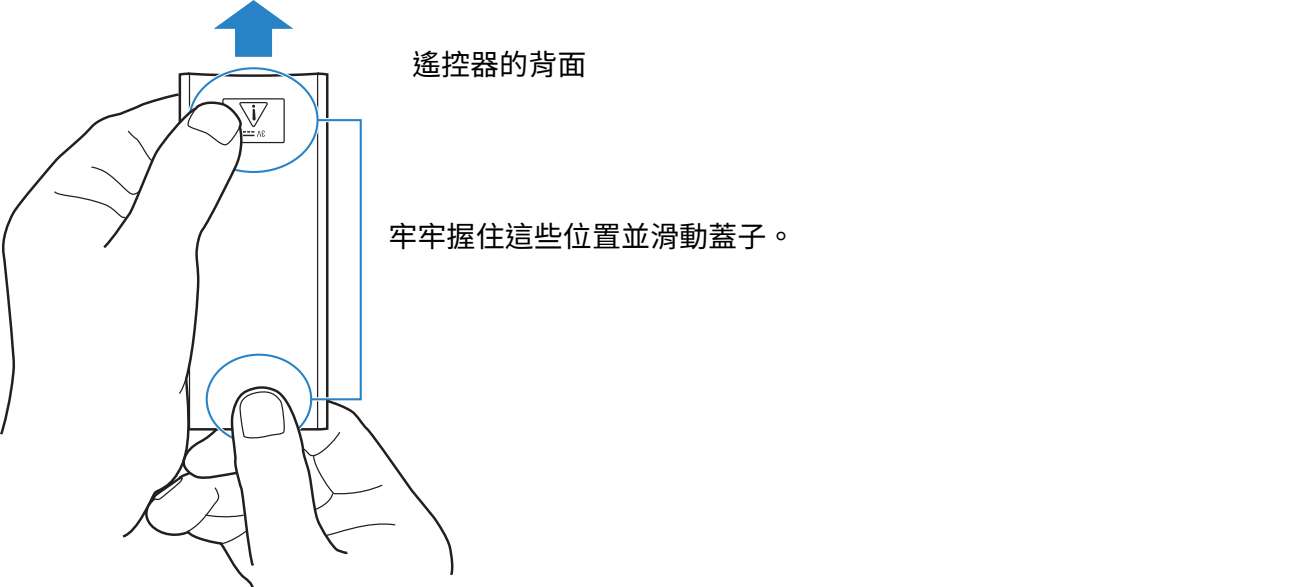 - 如圖所示將蓋子放在遙控器上,然後按箭頭方向將蓋子滑回其原位。