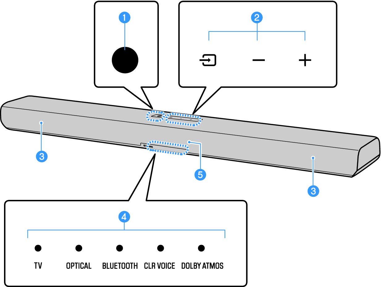 Cette section décrit les noms et les fonctions des pièces sur l’avant et le haut de la barre de son.