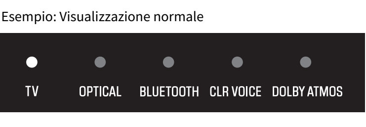 - Quando la soundbar viene accesa, tutti gli indicatori si accendono e poi alcuni rimangono accesi per mostrare lo stato delle impostazioni.