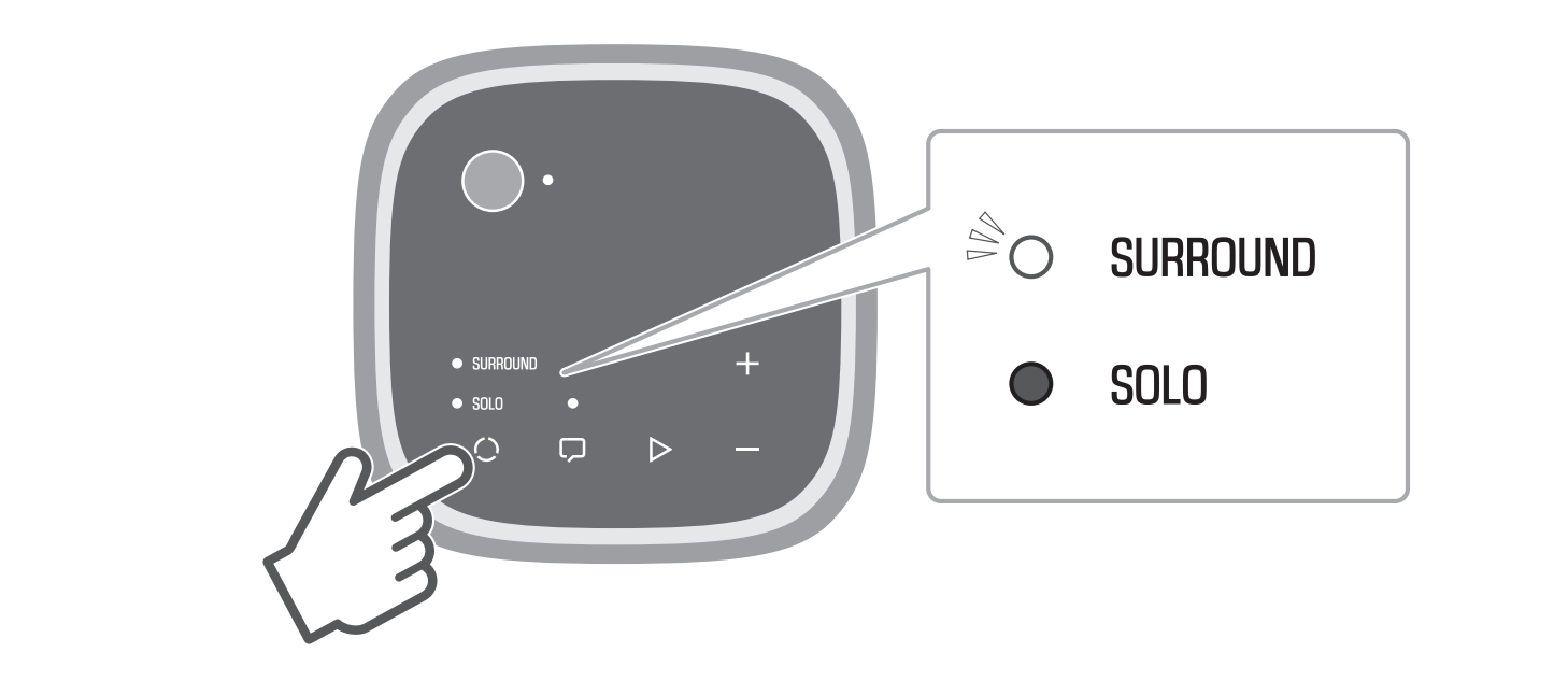 - 檢查無線揚聲器頂部的 SURROUND 燈是否亮起。如果 SOLO 燈亮起或閃爍,則按 P (模式)將模式切換到 SURROUND。