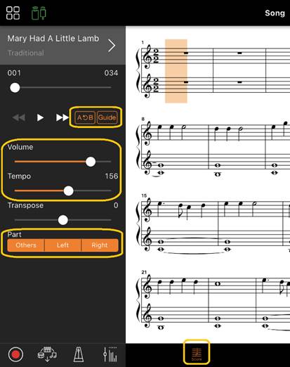 Du kan øve dig mere effektivt ved at bruge de funktioner, der er beskrevet i dette afsnit. Hvis du vil bruge disse funktioner, skal du vælge den melodi, du vil øve, og derefter trykke på [Score] nederst i Song-displayet for at få vist melodien.