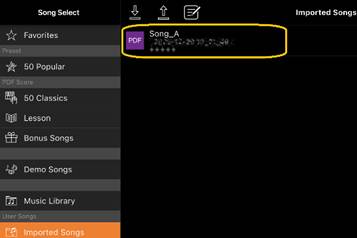 2-4 Selezionare la posizione in cui è stata salvata la partitura PDF nel passaggio 2-1, quindi toccare la partitura PDF desiderata da importare. Per i dettagli, fare riferimento alla documentazione dello smart device.