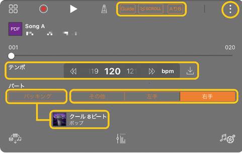 テンポ: テンポの変更ができます。インポートしたPDF楽譜の曲の場合、