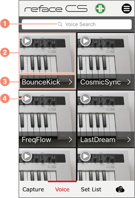 a) タップするとキーボードが表示され、音色のネーム検索およびタグ検索ができます。タグをタップすると、そのタグが割り当てられた音色を表示します。再度タグをタップするとタグ検索を解除します。