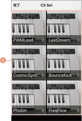 b) セットリストに追加されている音色一覧です。画像をタップすると音色データを楽器本体にバルク送信します。音色名をタップすると音色詳細画面に切り替わります。長押しするとセットリストから音色を削除および音色の順番を並べ替えることができるようになります。