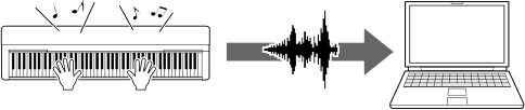 コンピューターでソング(MIDIファイル、オーディオファイル)を再生し楽器で鳴らすMIDIファイルの再生:MIDIファイル再生用のアプリケーションを使って、コンピューター上でソング(MIDIファイル)を再生し、楽器本体の音で鳴らします。 オーディオファイルの再生:オーディオ再生用のアプリケーションを使ってコンピューター上でオーディオファイルを再生し、楽器搭載のスピーカーで鳴らします。