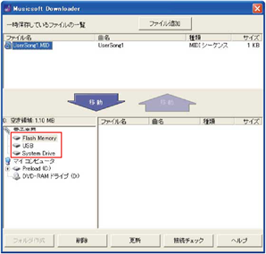 • ソングファイルやスタイルファイルなどを楽器本体に移動したい場合:[Flash Memory]をクリックします。
